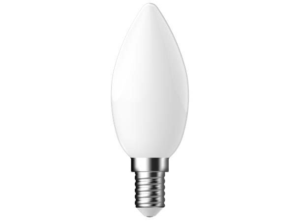 4.2W LED Mignon lyskilde Lyseffekt 470 lumen E14 sokkel Ra > 80 Varmhvit fargetemperatur 2700K Levetid 15 000 timer / L70 Størrelse ø35x97mm Dimbar Energiklasse E NB! Denne lyskilden har 360° rundtstrålende lys.