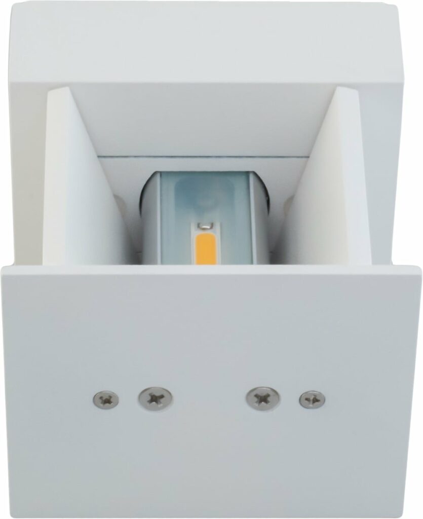 Meget fleksibel armatur som kan benyttes inn- og utendørs. Armaturen har tiltbare vegger på basen, som gjør det mulig å endre lysretningen. Velg mellom lys opp og ned, eller kun ned eller opp. Dimbar fase avsnitt. Produktet består av 2 komponenter – Base og front. 1: Velg base 2: Velg mellom firkantet og oval front i fargene hvit og sort.