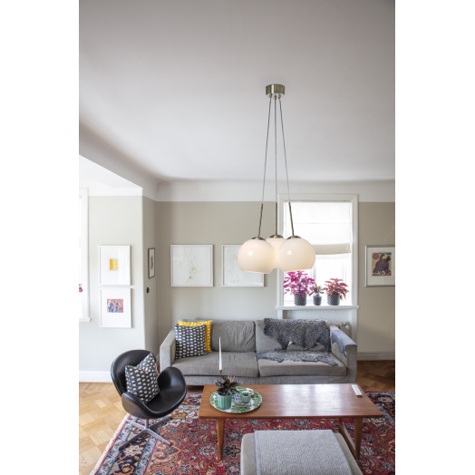 Klassisk taklampe med tre kupler i glass. Lampen gir et delikat og klassisk uttykk, med god lysspredning. Lampen finnes i to varianter, Messing/Opal og Sort/Sotet Grunnet takkoppens størrelse, anbefaler vi at alle kulene henger i samme høyde. Dette gir lampen er morsom, men tradisjonel utforming